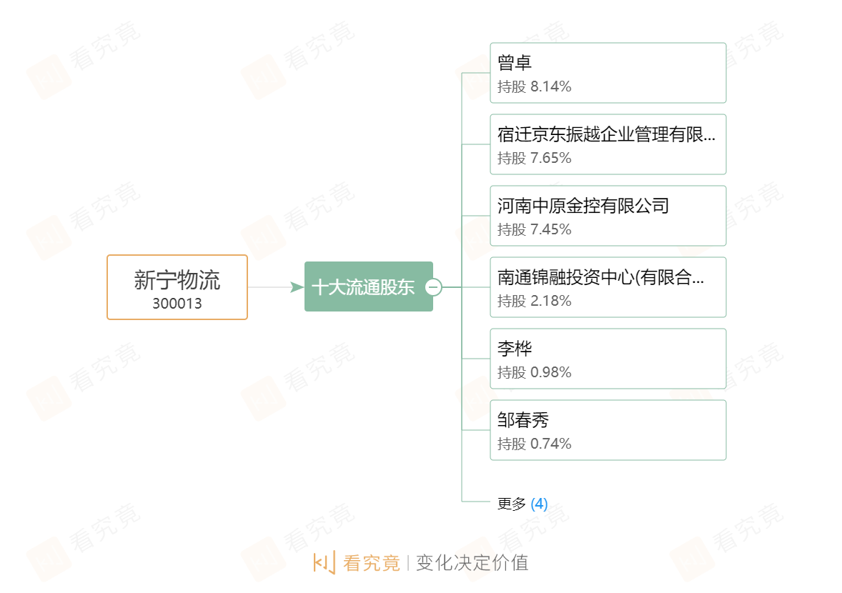此外,新宁物流还处于无控股股东及实控人的尴尬状态。其股权结构较为分散,据企查查显示,第一大股东曾卓持股比例仅为8.13%,京东振越次之,持股比例为7.63%,中原金控持股比例为7.43%。