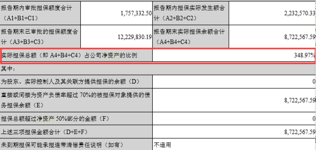 12月18日,金科股份公告称,拟取消对12家部分控股子公司担保额度合计19.23亿元,包括重庆恒春置业有限公司、山西金科产业发展有限公司等公司,但增加济南金泉房地产开发有限公司,聊城市金民房地产开发有限公司等10家公司51.8亿担保。这意味着原本担保占净资产比例到371.60%的金科,担保水平将进一步“爆表”。