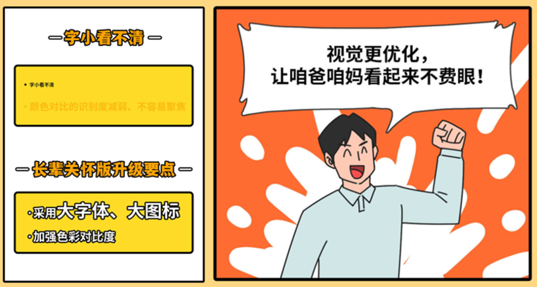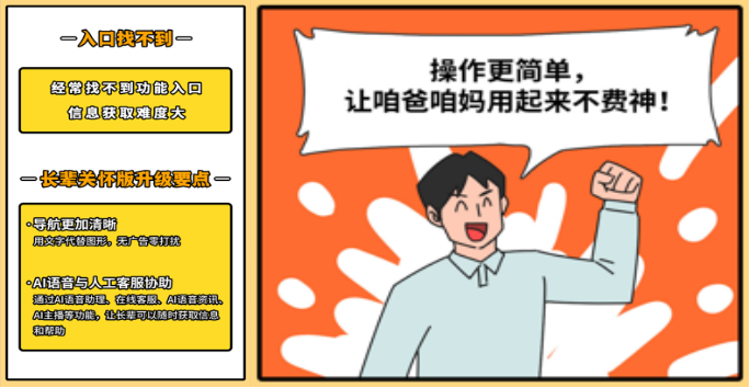 首先,为了满足老年人在文字大小、色彩对比度、信息呈现等方面的独特需求,“长辈关怀版”各频道首页采用容易阅读的大字体和容易辨认的大图标,加强色彩对比度,用图形及色彩帮助提升认知达到清晰表意的效果,提供了更佳的视觉体验。