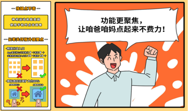 其次,部分老年客户随年龄增长,运动技能和心理认知能力都会变弱,导致精细的屏幕操作和对复杂信息的处理能力都越来越弱。“长辈关怀版”通过精简分支入口,减少注意力干扰。APP首页核心功能区的宫格位,从之前的9个减少到5个,缩减接近50%;交易频道的功能入口从之前的35个减少到15个,缩减接近60%,改造之后界面更加精简和聚焦。为避免出现误触,屏幕中各功能图标的感应区域,在长辈关怀模式下扩大了近80%,点击无需再“小心翼翼”,同时减轻了认知负荷,为老年用户提供了更佳的使用体验。
