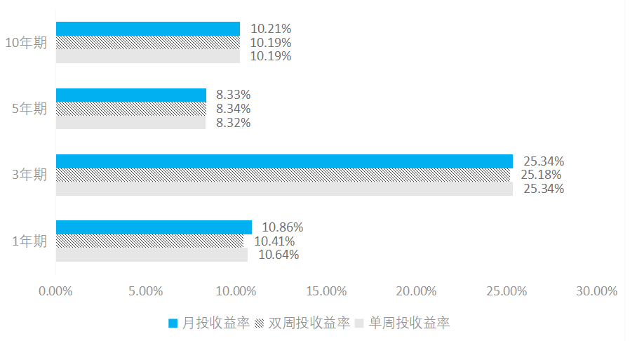 在定投时间为1年时,月投、双周投以及单周投平均年化收益率相差0.2个百分点以上;到定投5年以上时,不同频率的收益率的差别缩小到0.1个百分点以内。