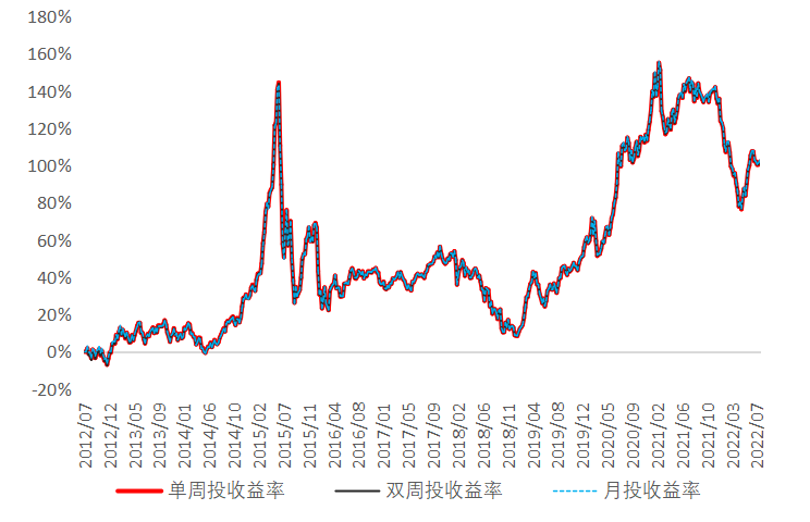 从上图中我们能够发现,以普通股票型基金指数为标的,2012年起开始定投并坚持至2022年,以不同时间频率定投的收益率差别很小,不论是周定投、双周定投还是月定投,累计收益率曲线基本贴合。