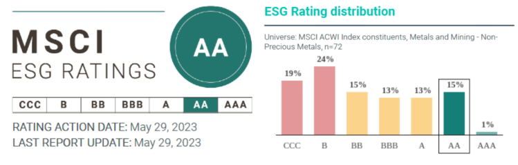 2023年5月,摩根士丹利资本国际公司(MSCI)发布最新报告,洛阳钼业的ESG评级从A级升至AA级,处于全球有色金属行业MSCI评级前16%,这对于中国乃至全球资源行业都是一个难得的成绩。