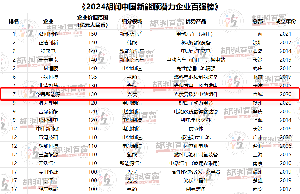日前,胡润研究院正式发布《2024胡润中国新能源潜力企业百强榜》(Hurun China Renewable Energy Companies with Potential 2024)。凭借在异质结光伏领域的卓越表现和强劲的综合实力,华晟成功上榜,位列新能源百强榜总榜第七位,是该榜单光伏细分领域中“企业价值”最高的新能源企业之一。